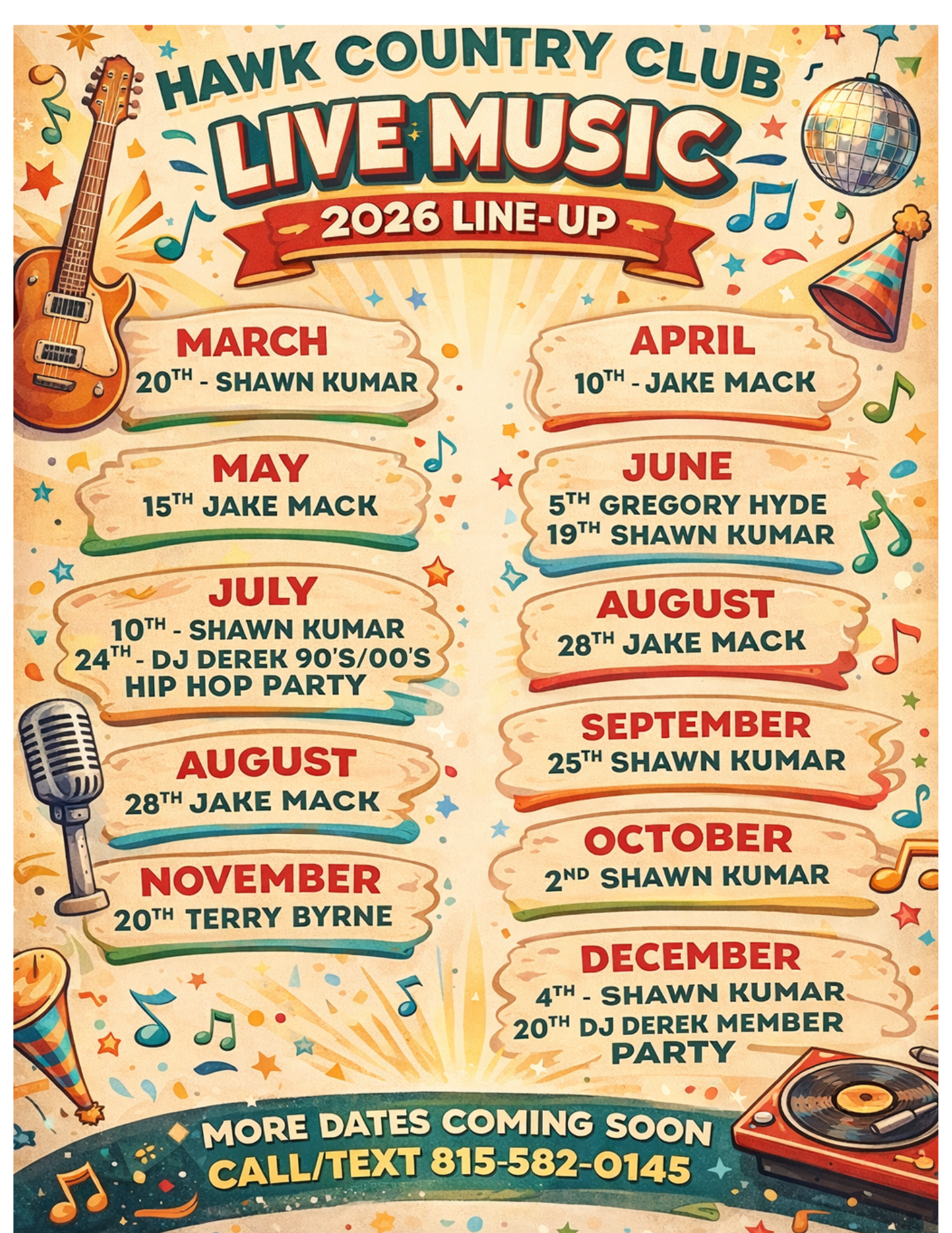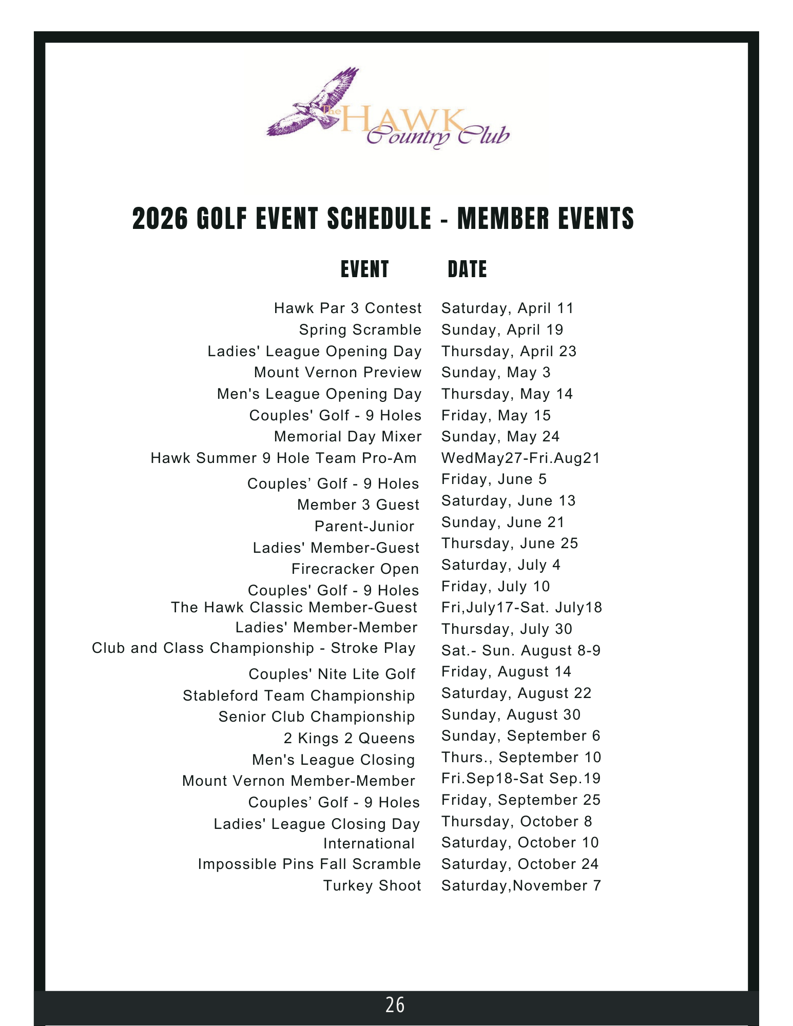 Member Events at The Hawk CC Upcoming Events Check out our latest events and activities crafted just for you and yours. Join us to experience engaging moments and make lasting memories. Golf Season Ahead 2026 Golf Member Schedule The Hawk is now open for the season! Very excited for what is ahead at The Hawk and the whole team is very excited to see you soon. 4/5/2026 Easter Brunch Join us at The Hawk for our specialty easter brunch for the whole family! Multiple Dates 2026 Live Music Lineup Check image for information on 2026 Live Music dates at The Hawk CC! See you soon! See All Events